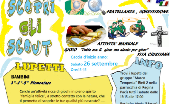 Sono tutti invitati a partecipare alla prima caccia annuale di branco. Vi aspettiamo numerosi sabato 26 settembre dalle 15:15 alle 17:00 presso la parrocchia di Regina Pacis!!