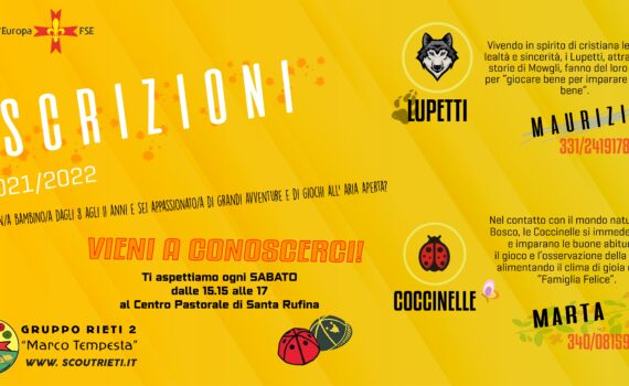 Gioco, divertimento, vita all’aria aperta e molto altro! Le coccinelle e i lupetti (dagli 8 agli 11 anni) non vedono l’ora di accogliere nuove/i bambine/i. Iscrizioni aperte. Per qualsiasi info potete: – visitare il sito, – contattare i responsabili, – presentarvi nelle “tane”. VIENI A CONOSCERCI, Ti aspettiamo ogni sabato […]