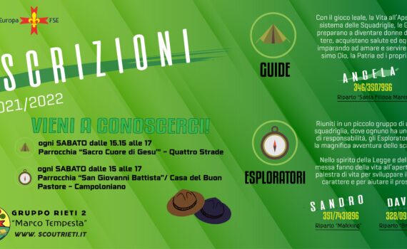 Avventura, divertimento, vita all’aria aperta e molto altro! Le guide e gli esploratori (dagli 11 ai 15 anni) non vedono l’ora di accogliere nuove/i ragazze/i. Iscrizioni aperte. Per qualsiasi info potete: – visitare il sito, – contattare i responsabili, – presentarvi nelle sedi. VIENI A CONOSCERCI, Ti aspettiamo ogni sabato […]