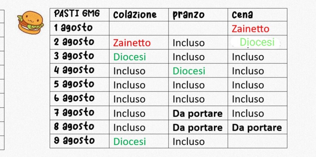 Alcuni pasti (in verde) sono offerti dalla Diocesi di Rieti.